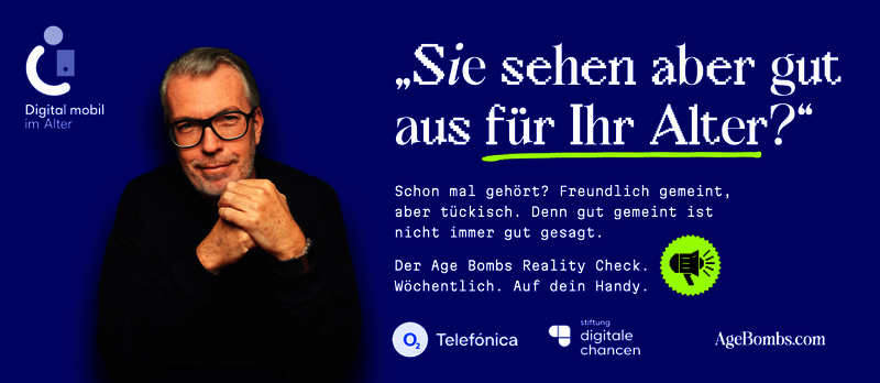 Age Bombs ist eine kreative und beratungsstarke Agentur die sichtbar macht, wie Altersbilder Entscheidungen prägen und wie eine altersdiverse Gesellschaft aussehen kann. Mehr über Age Bombs und die Angebote finden Sie hier: AgeBombs.com